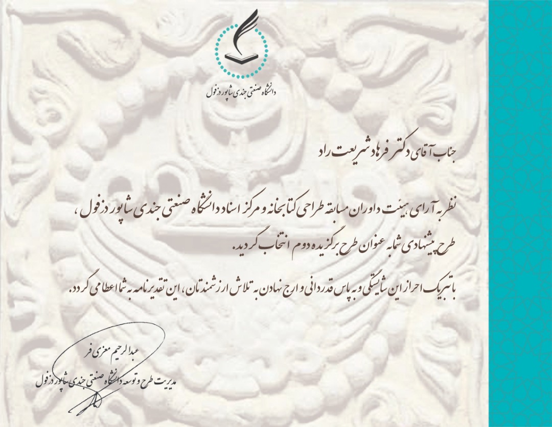 طرح پیشنهادی دو عضو هيأت علمى دانشكده معمارى و شهرسازى، دكتر فرهاد شريعت راد و دكتر كيوان جورابچى، در مسابقه ملی طراحى کتابخانه مرکزی و مرکز اسناد دانشگاه صنعتی جندی شاپور دزفول، به عنوان طرح برگزیده دوم انتخاب گردید. اين مسابقه به صورت محدود و به دعوت دانشگاه صنعتی جندی شاپور در بهار سال 1400 برگزار شد.