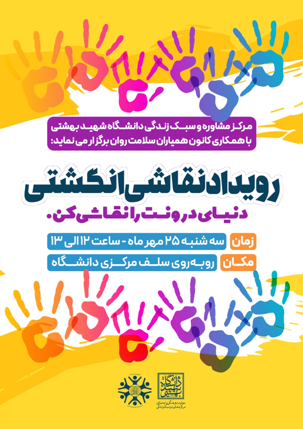 رویداد نقاشی زمینی با رنگ انگشتی در مورخ 1402/07/25 سه شنبه  مقابل غرفه مرکز مشاوره و سبک زندگی دانشگاه به مناسبت هفته سلامت روان با استقبال بی دانشجویان برگزار شد.
