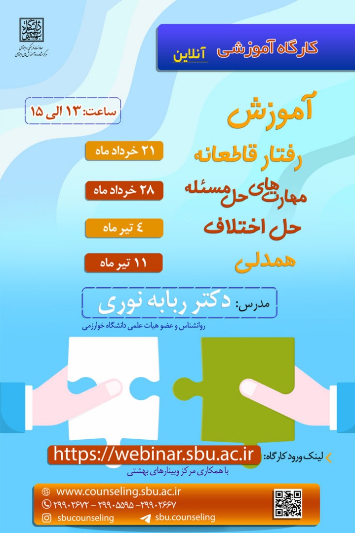 مركز مشاوره و آموزشهای اجتماعی برگزار مي‌كند كارگاه آموزشی آنلاين «رفتار قاطعانه» امروز شنبه 21 خرداد ١٤00 دانشجويان و دانشگاهيان گرامی، جهت شركت در كارگاه آموزشی مذكور، می‌توانيد از طريق لينک زير اقدام فرماييد. https://webinaronline.ir/Link/S2237671135