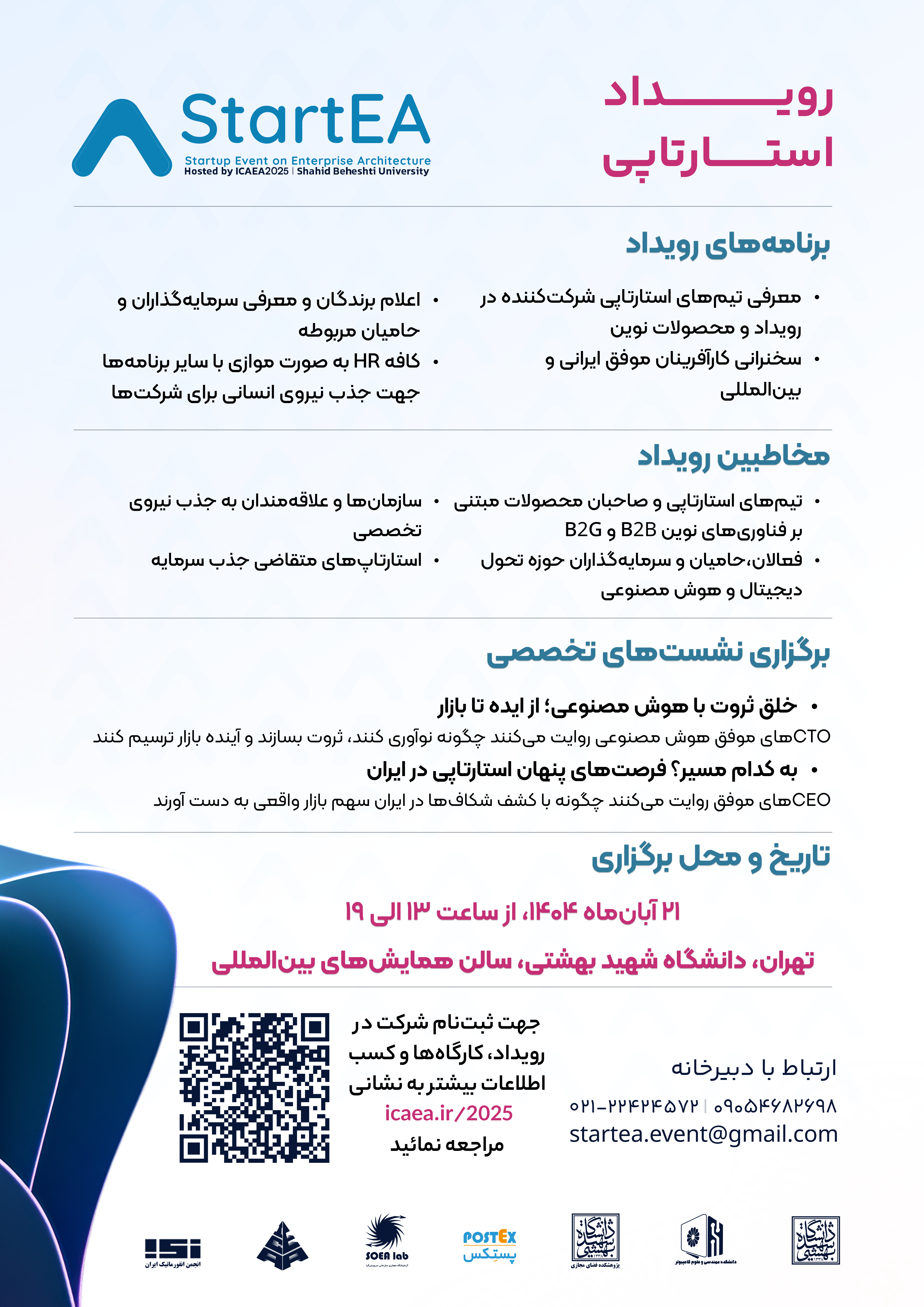 رویداد StartEA نیز در کنار همایش پیشرفتهای معماری سازمانی برای اولینبار با مضمون گردهمآوری استارتاپهای فعال در طراحی و توسعه ابزارهای هوشمند و مبتنی بر فناوریهای نوین آغاز به کار کرده است. علاقهمندان به شرکت در کارگاهها، Cafe HR و سایر برنامههای رویداد میتوانند با مراجعه به وبسایت همایش، تب رویداد StartEA نسبت به کسب اطلاعات بیشتر اقدام نمایند.