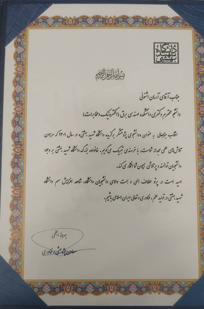 در سی و دومین مراسم تقدیر از پژوهشگران برگزیده دانشگاه شهید بهشتی که در روز سه‌شنبه 29 آذر ماه در تالار ابوریحان برگزار گردید، آقای آرمان اشنوئی فارغ‌التحصیل مقطع دکتری دانشکده مهندسی برق (الکترونیک و مخابرات) تحت راهنمایی آقای دکتر مرتضی خردمندی به‌عنوان دانشجوی پژوهشگر برگزیده در حوزه فنی مهندسی انتخاب شدند.