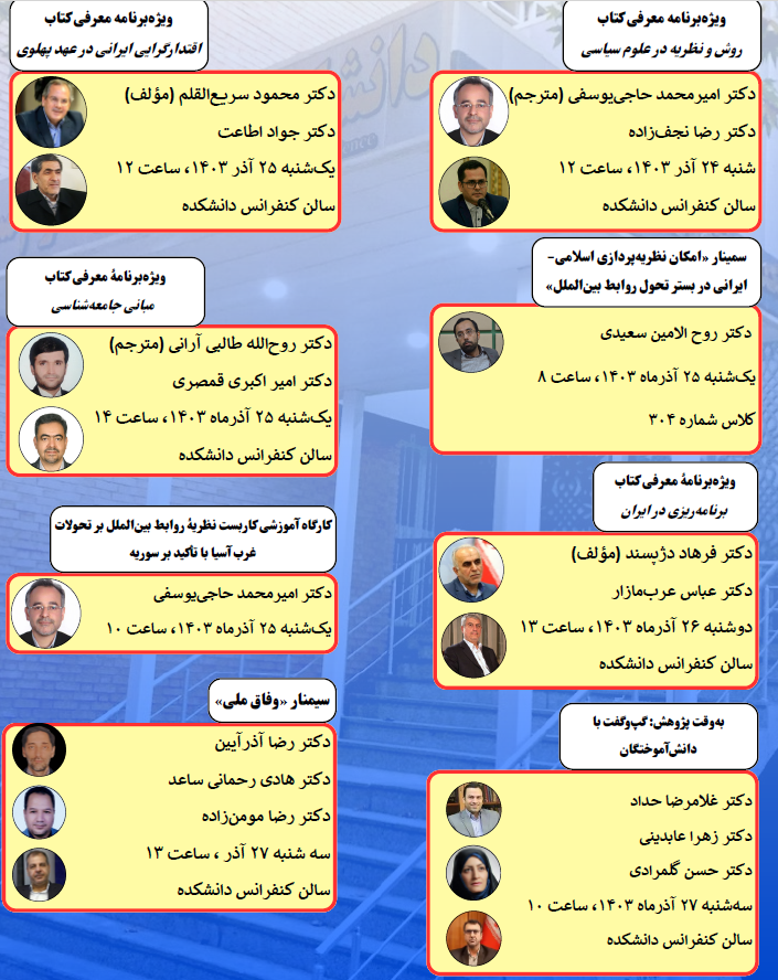 برنامه هفته پژوهش دانشکده اقتصاد و علوم سیاسی 1403 با همکاری انجمن های علمی اقتصاد و علوم سیاسی