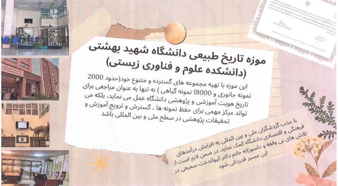 با اعطای پروانه احداث موزه تاریخ طبیعی دانشگاه شهید بهشتی به دانشکده علوم و فناوری زیستی در تاریخ 1404/10/03 این موزه با تهیه مجموعه های گسترده و متنوع خود(حدود 2000 نمونه جانوری و 18000 نمونه گیاهی ) نه تنها به عنوان مراجعی برای تاریخ هویت آموزشی و پژوهشی دانشگاه عمل می نماید، بلکه می تواند مرکز مهمی برای حفظ نمونه ها ، گسترش و ترویج آموزش و تحقیقات پژوهشی در سطح ملی و بین المللی باشد.
