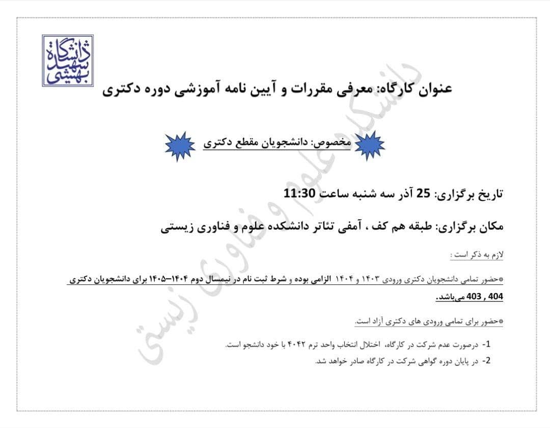 کارگاه معرفی مقررات و آئین نامه آموزشی دوره دکتری روز سه شنبه 1404/09/25 از ساعت11:30 با حضور آقای دکتر ملاصالحی معاونت محترم آموزشی در سالن آمفی تاتر دانشکده علوم و فناوری زیستی برگزار می شود.لازم به ذکر است حضور دانشجویان دکتری ورودی 1403 و 1404 الزامی بوده و در پایان دوره ، گواهی شرکت در کارگاه صادر خواهد شد.