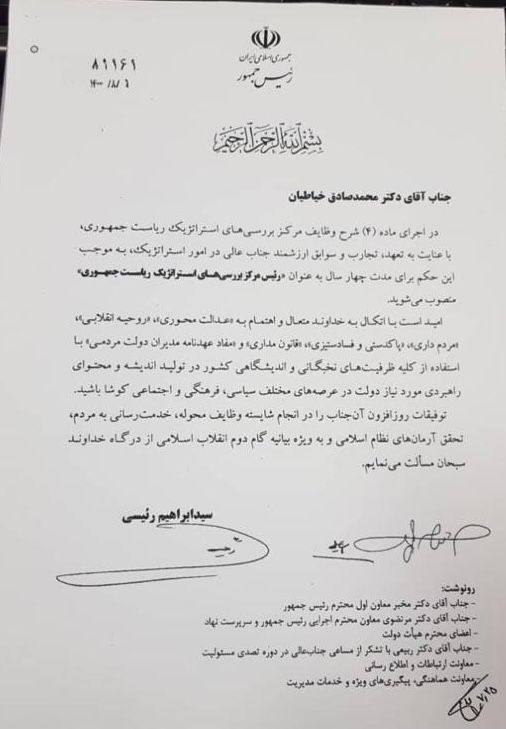 با حکم رئیس جمهور رئیس جمهور (( دکتر محمد صادق خیاطیان)) عضو هیئت علمی دانشگاه شهید بهشتی به عنوان رئیس مرکز بررسی های استراتژیک انتخاب شد.