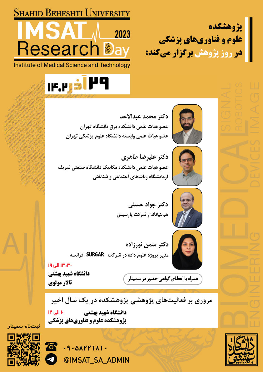 پژوهشکده علوم و فناوریهای پزشکی با افتخار در هفتهی پژوهش میزبان شما پژوهشگران عزیز در رویداد یک روزه “IMSAT Research Day 2023" با هدف معرفی دستاوردها و پیشرفتهای اخیر در زمینههای علوم مغز و شناخت، هوش مصنوعی در پزشکی، پردازش تصاویر پزشکی، پزشکی از راه دور و فناوریهای نوین پزشکی میباشد. در این رویداد با حضور اساتید برجسته فرصت مناسبی جهت آشنایی، تعامل اطلاعات و گفتگو برای شرکتکنندگان فراهم میشود.