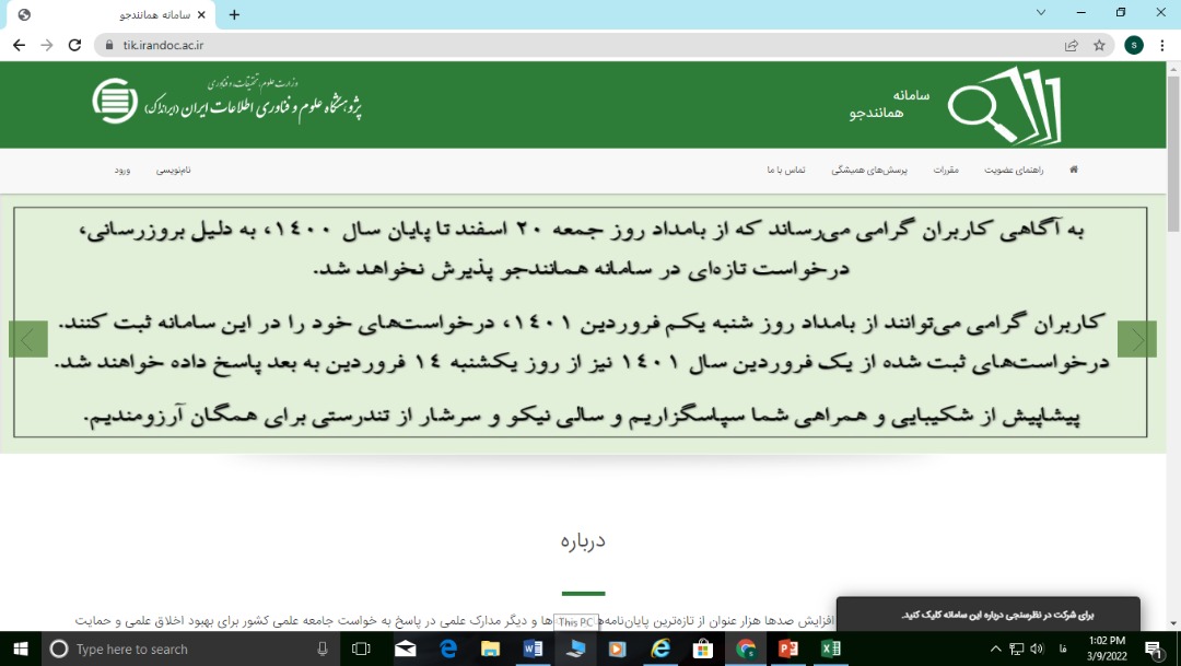 از تاریخ بیستم اسفند سایت سامانه همانندجو به علت به روز رسانی تا پیان سال قطع می باشد دانشجویان برای ثبت درخواست خود باید از تاریخ یکم فروردین به این سایت مراجعه فرمایند.