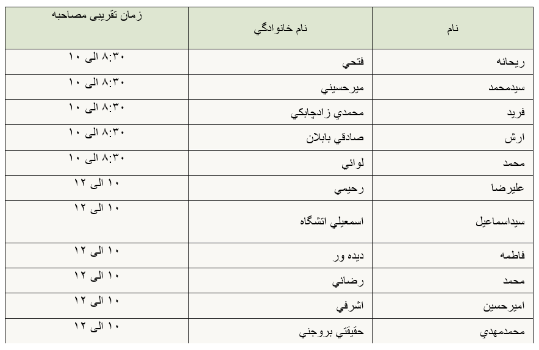 جدول زمانبندی مصاحبههای دکتری 1404 رشته بیمسنجی یکشنبه مورخ 18 خردادماه 1404 به شرح زیر است.