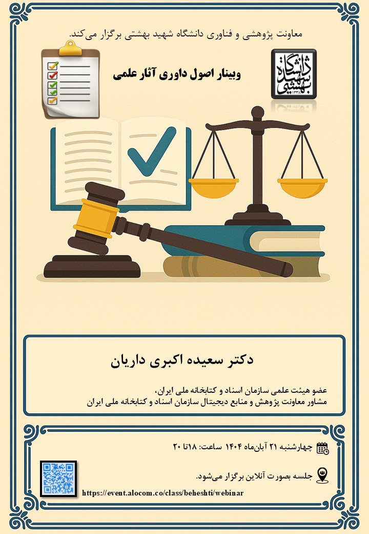 وبینار پژوهشی با عنوان"اصول داوری آثار علمی" در روز چهارشنبه مورخ 1404/8/21 از ساعت 18 الی 20 توسط سرکار خانم دکتر سعیده اکبری داریان عضو محترم هیأت علمی سازمان اسناد و کتابخانه ملی ایران به صورت مجازی برگزار خواهد شد.