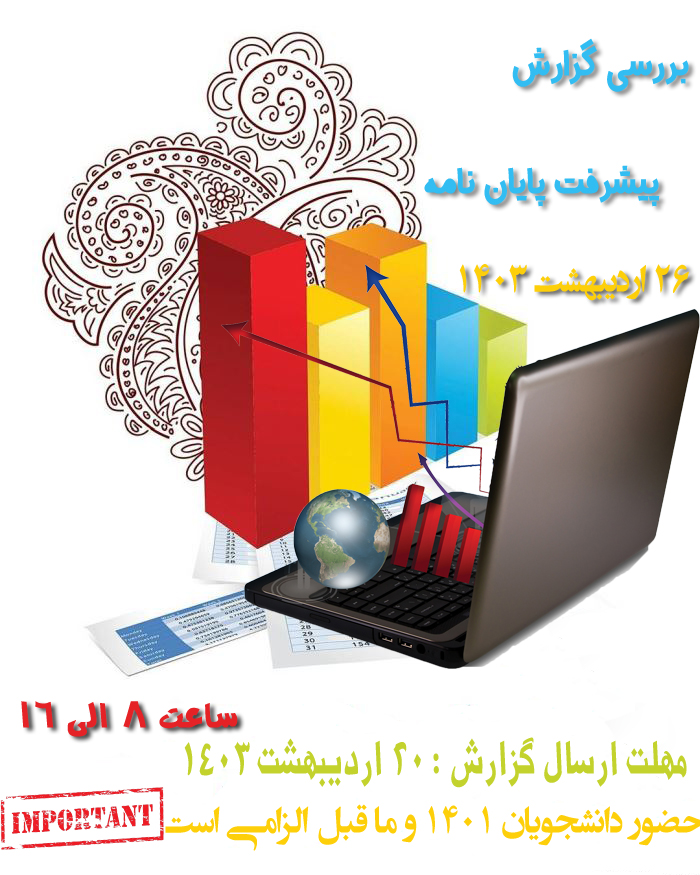 جلسه گزارش پبشرفت پایان نامهها، چهارشنبه مورخ 26 اردیبهشت 1403 برگزار خواهد شد. حضور دانشجویان 1401 و ماقبل الزامی است. مقتضی است گزارشها در قالب تعیین شده، حداکثر تا 20 اردیبهشت، به خانم شهبازی تحویل شود.