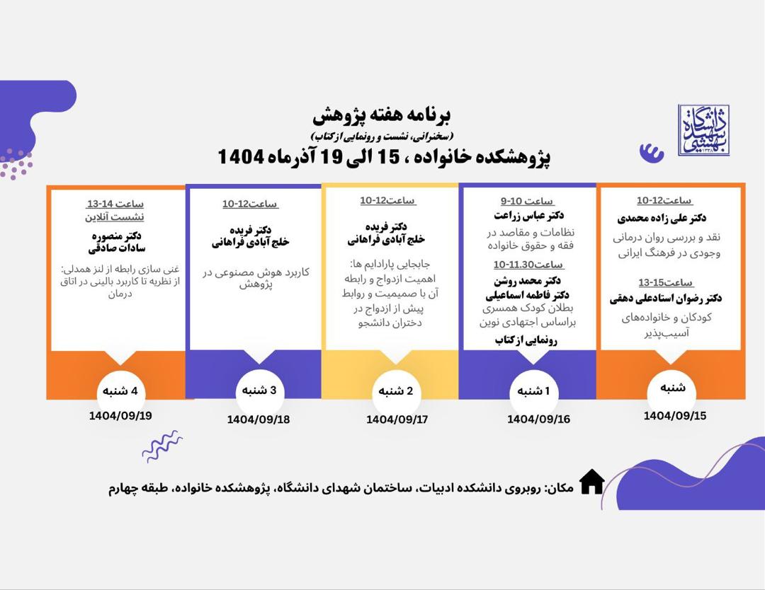 برنامه هفته پژوهش پژوهشکدۀ خانواده: 15 الی 19 آذرماه 1404