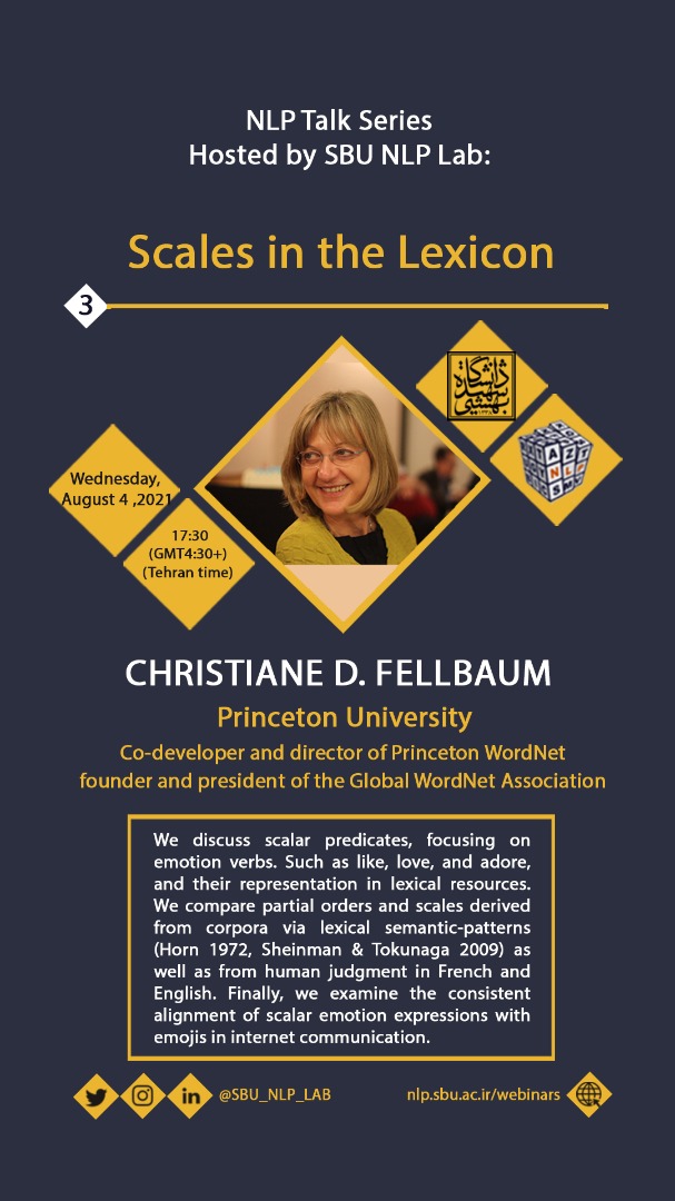 The Third NLP Talk Series webinar will be held by the Natural Language Processing Laboratory of the Faculty of Computer Science and Engineering of SBU on Wednesday, August, 4, 2021 at 17.30 (GMT 4.30+) Tehran time. This webinar, which is titled “Scales in the Lexicon”, will be lectured by Christiane D. Fellbaum, co-developer and director of Princeton WordNet, and founder and president of the Global WordNet Association.
