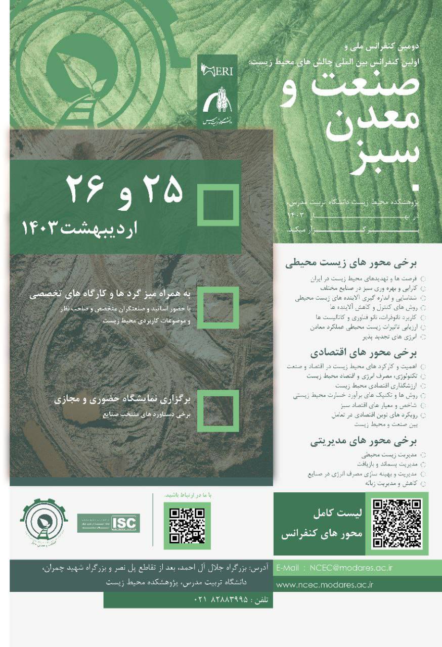 به گزارش دانشکده مهندسی آب، در راستای ایجاد بستری مناسب برای تبادل نظر و ارتقا سطح دانش به منظور ارائه راهکارهای مناسب برای پیشگیری از وقوع بحران‌های محیط زیستی و ترغیب به استفاده از فناوری‌های سبز،‌ دومین کنفرانس ملی و اولین کنفرانس بین‌المللی چالش‌های محیط زیست: صنعت و معدن سبز، طی روزهای  25 و 26 اردیبهشت ماه 1403 در دانشگاه تربیت مدرس برگزار می‌شود.