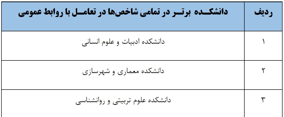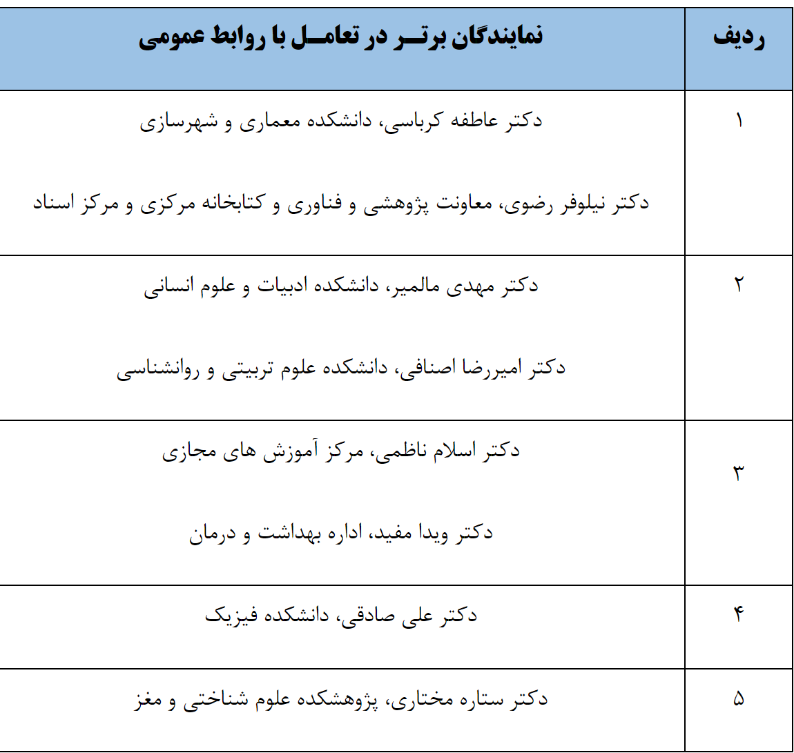 در جشنواره امسال که با شعار «روابط عمومی: تعامل و اطلاع رسانی آگاهانه و خردورزانه» برگزار گردید، از دانشکده معماری و شهرسازی به عنوان «دانشکـده  برتـر در تمامی شاخص‌ها در تعامـل با روابط عمومی»، و همچنین از دو نفر از اعضای هیات علمی این دانشکده، خانم دکتر عاطفه کرباسی به عنوان «نماینده برتر در حوزه روابط عمومی دانشکده معماری و شهرسازی» و خانم دکتر نیلوفر رضوی به عنوان «نماینده برتر در حوزه معاونت پژوهشی و فناوری و کتابخانه مرکزی و مرکز اسناد» تقدیر گردید.​​​​​​​