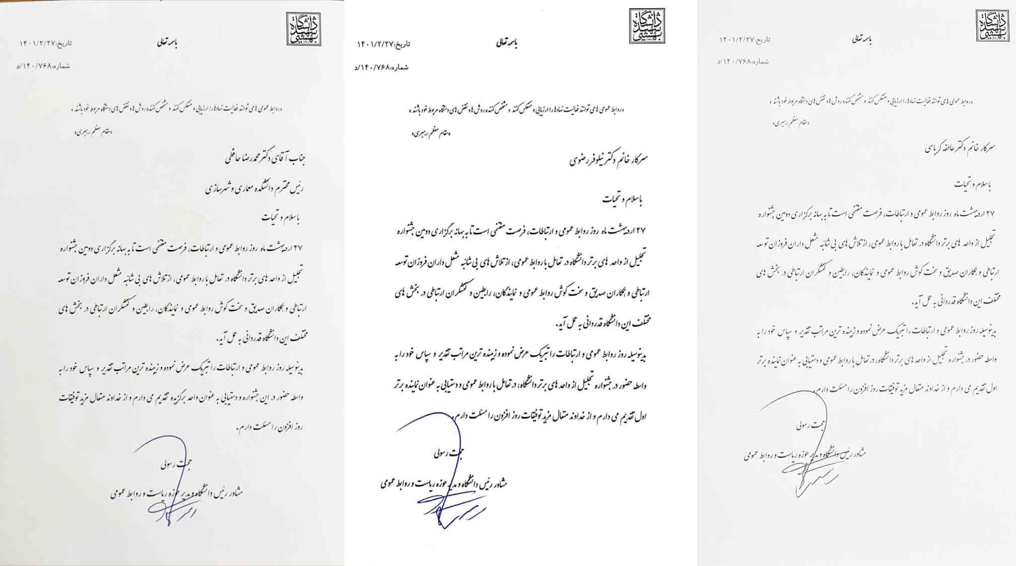 «دومین جشنــواره معرفـی و تجلیــل از واحدهـای برتـر دانشگـاه شهیـد بهشتـی در تعامل با روابط عمومی» با حضور ریاست دانشگاه آقای دکتر نصیری و جمعی از مدیران، اعضای هیأت علمی، کارکنان و دانشجویان دانشگاه روز یکشنبه اول خرداد 1401 در سالن خوارزمی مرکز همایشهای بینالمللی برگزار شد.