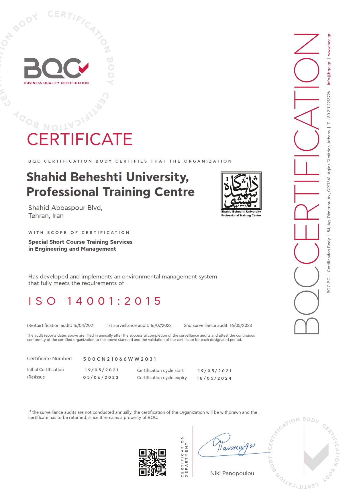 با این رویکرد و هم راستايي با الزامات و موازین چهار موضوع استاندارد ذیل، و بر اساس برنامه راهبردی پیامد گرا و خط مشي نظام مديريت يكپارچه ، هر ساله نسبت به برگزاري جلسات بررسی ارزیابی مميزي و تمديد اعتبار، از موسسۀ گواهي دهنده BQC و اعتبار دهنده ESYD (مستقر در اتحادیه اروپا) ،فعالیت هایی مستمرکیفی و اثر بخشی آموزشی ، را در قالب اصلاح و بهبود روش های اجرایی و سامانه های نرم افزاری معمول نموده است. از اینرو متعاقب برگزاری جلسه ممیزی ، در مورخ 1402/04/15 به دریافت گواهینامه استاندارد در محوهای ذیل مفتخر گردید: