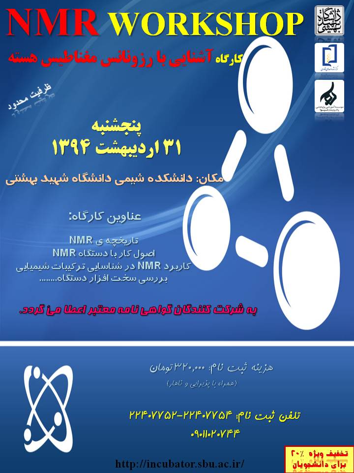 • کارگاه آشنایی با رزونانس مغناطیس هسته (NMR WORKSHOP) در تاریخ پنجشنبه 31 اردیبهشت 1394 در دانشکده شیمی برگزار می‌شود.