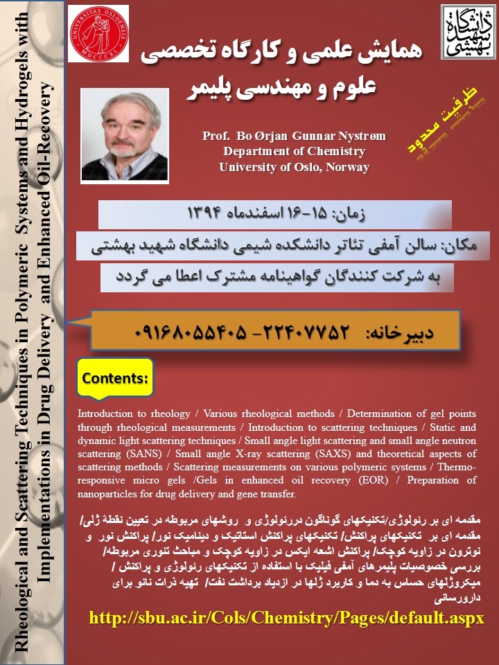 • کارگاه علوم و مهندسی پلیمر با حضور پروفسور Bo Nystrom از دانشگاه اسلو نروژ برگزار می‌شود.