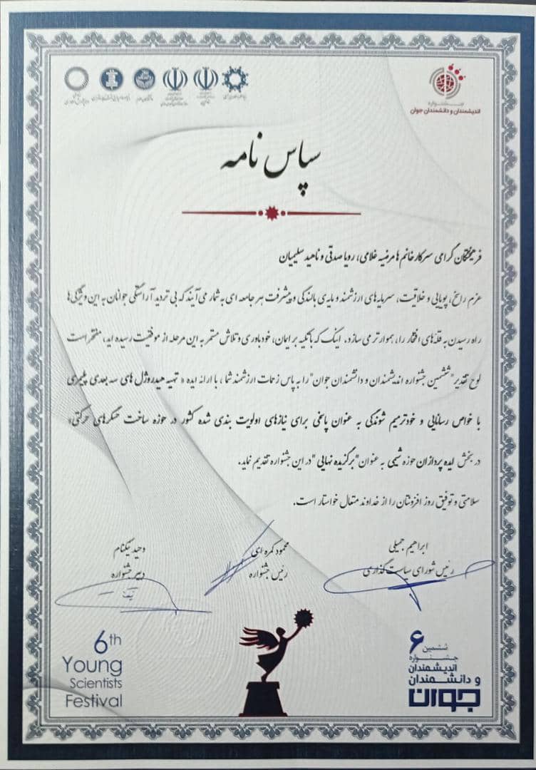 ایده ارایه شده این گروه با عنوان "تهیه هیدروژل های سه بعدی با خواص رسانایی و خود ترمیم شوندگی به عنوان پاسخی برای نیازهای اولویت بندی شده کشور در حوزه ساخت حسگرهای حرکتی" در حوزه شیمی به عنوان برگزیده نهایی انتخاب و اعتبار حمایتی 120 میلیون تومانی به آن اهدا شد.