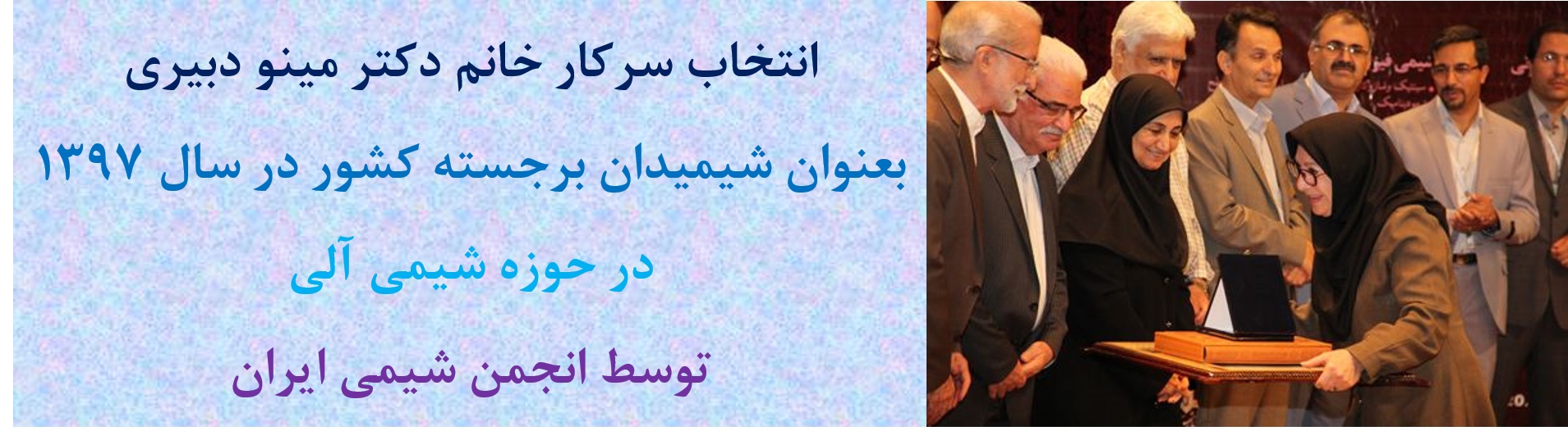 در مراسم افتتاحیه بیستمین کنگره شیمی ایران در دانشگاه فردوسی مشهد، سرکار خانم دکتر مینو دبیری استاد شیمی آلی دانشکده علوم شیمی و نفت بعنوان شیمیدان برجسته کشور در سال 1397 از طرف انجمن شیمی ایران معرفی و مورد تقدیر قرار گرفتند.