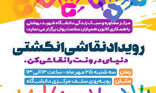 رویداد نقاشی زمینی با رنگ انگشتی در مورخ 1402/07/25 سه شنبه  مقابل غرفه مرکز مشاوره و سبک زندگی دانشگاه به مناسبت هفته سلامت روان با استقبال بی دانشجویان برگزار شد.