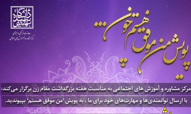 مرکز مشاوره و آموزش های اجتماعی به مناسبت فرا رسیدن" هفته بزرگداشت مقام  زن " اقدام به برگزاری پویش « من موفق هستم » نموده است. هدف این پویش شناسایی دانشجویان موفق ، توانمند و با استعداد درحوزه های مهارت های  فردی و اجتماعی  مانند: مهارت های جرات ورزی، نه گفتن، کنترل خشم، کنترل هیجان، قدرت بیان بالا، نویسندگی، مواجهه با مشکلات وحل مسئله.... است شایان ذکر است علاقمندان به شرکت در این  پویش  می توانند از طریق ارسال موفقیت های خود در قالب کلیپ با فرمت  mp4 در پویش مذکور شرکت نمایند.