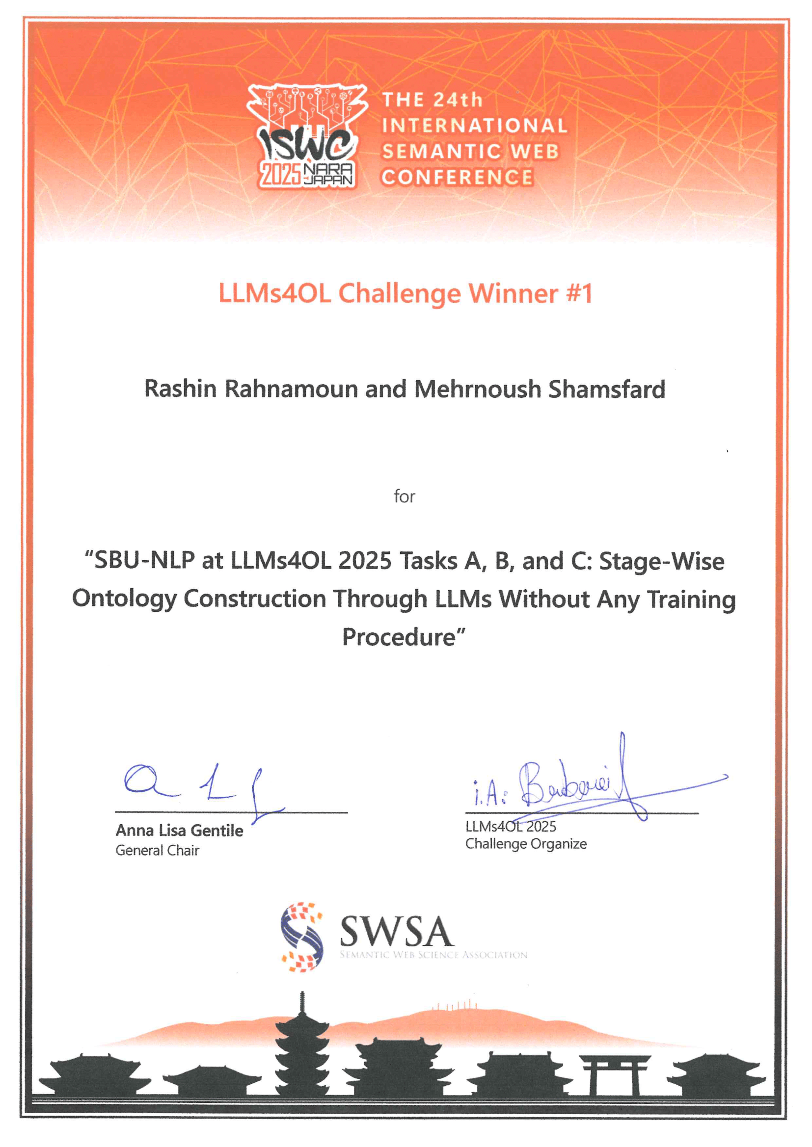به قلم راشین رهنمون و مهرنوش شمس‌فرد، توانست در نتیجه کلی همه زیر وظایف عملکرد بهتری نسبت به تمامی تیم‌ها داشته باشد و گواهی رسمی «برنده رتبه اول چالش LLMs4OL 2025» را دریافت کند.