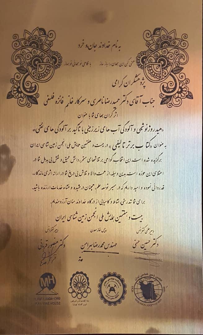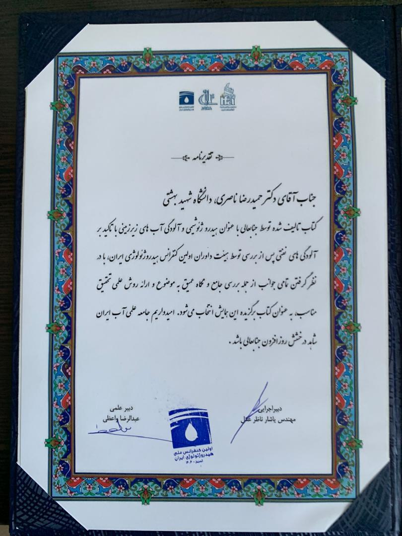 کتاب "هیدروژئوشیمی و آلودگی آب های زیرزمینی با تاکید بر آلودگی های نفتی" نوشتۀ حمیدرضا ناصری، استاد دانشکدۀ علوم زمین دانشگاه شهید بهشتی و فائزه فلسفی، دانش‌آموختۀ دانشگاه شهید بهشتی در بیست و هفتمین همایش ملی انجمن زمین شناسی ایران، تهران و در اولین کنفرانس ملی هیدروژیولوژی ایران، تبریز به عنوان کتاب برتر برگزیده شده است.