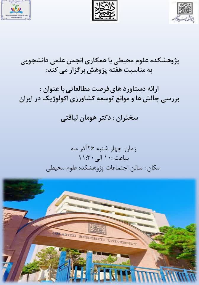 به مناسبت هفته پژوهش، در روز چهارشنبه 26 آذر ماه سخنرانی با عنوان چالش ها و موانع توسعه کشاورزی اکولوژیک در ایران توسط آقای دکتر هومان لیاقتی در محل پژوهشکده علوم محیطی انجام شد. در این جلسه که با حضور جمعی از دانشجویان و اعضای هیات علمی پژوهشکده علوم محیطی و مهمانان از خارج از دانشگاه برگزار شد، آقای دکتر لیاقتی در ابتدا به بیان تاریخچه کشاورزی اکولوژیک در ایران و جهان پرداختند و در ادامه با ارائه مثال های موفقی از توسعه کشاورزی اکولوژیک در جهان به بیان تجارب خود در مدت فرصت مطالعاتی اخیر خود در کشور آلمان و دانشگاه کاسل پرداختند. ایشان ضمن اشاره به نقش حکمرانی در پیشبرد کشاورزی اکولوژیک از دیدگاه اساتید به نام این رشته مانند خانم پرفسور اوستروم و آقای پرفسور تیل، تجارب سایر کشور ها را در زمینه حکمرانی توام اکولوژیک و محیط زیستی بیان داشتند. در ادامه آقای دکتر اسماعیل شهبازی عضو هیات علمی و استاد تمام سازمان تات و عضو فرهنگستان علوم جمهوری اسلامی ایران، که سالیان طولانی همکاری موثری با دانشگاه شهید بهشتی در پردیس زیراب داشته اند، علاوه بر تاکید بر لزوم گسترش کشاورزی اکولوژیک در ایران به بیان تجارب ارزشمند خود از تشکیل تعاونی های کشاورزی و اجرای اصلاحات ارضی در ایران پرداختند و بر نقش زنان در توسعه این نهادها و کشاورزی اکولوژِیک تاکید داشتند. در پایان پرسش و پاسخ میان شرکت کنندگان و سخنران محترم انجام شد.