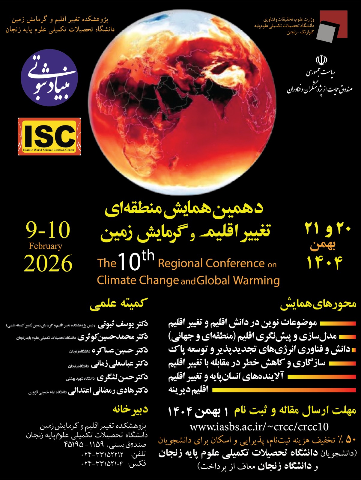 به اسـتحضار می رسانـد پژوهشـکده تغییر اقلیم و گرمایش زمین دانشـگاه تحصـیلات تکمیلی علوم پـایه زنجـان در نظر دارد دهمین همایش منطقه ای تغییر اقلیم و گرمایش زمین را در تاریخ 21 و 22 بهمن ماه سال جاری برگزار نماید. مزید امتنان خواهد بود تا مراتب به نحو مقتضـی به اساتیـد، دانشـجویان و پژوهشـگران عزیز، به ویژه علاقمندان رشـته های فیزیک، شـیمی، محیط زیست، آبشناسی، هوا و اقلیم، جغرافیا، کشاورزی و عمران اطلاع رسانی گردد.