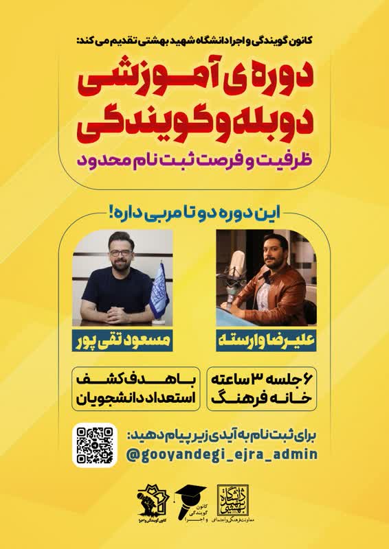 اولین دوره آموزشی حضوری دوبله و گویندگی با حضور صدا بازیگران موسسه فرهنگی-هنری سورن، آقایان مسعود تقی‌پور و علیرضا وارسته برگزار می‌شود. این دوره با هدف کشف استعداد دانشجویی به همت کانون گویندگی و اجرا دانشگاه شهیدبهشتی برگزار می‌شود. این دوره شامل ۶ جلسه ۳ ساعته می‌باشد که در خانه فرهنگ برگزار می‌شود. برای اطلاعات بیشتر پیرامون ثبت‌نام به آیدی تلگرام @gooyandegi_ejra_admin پیام دهید.