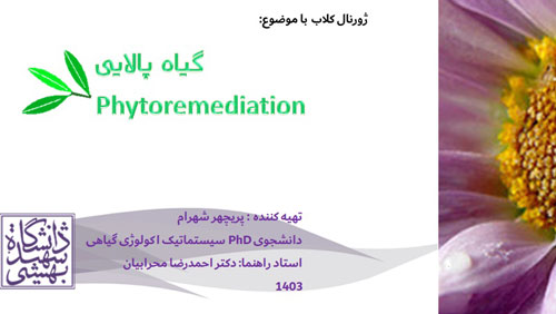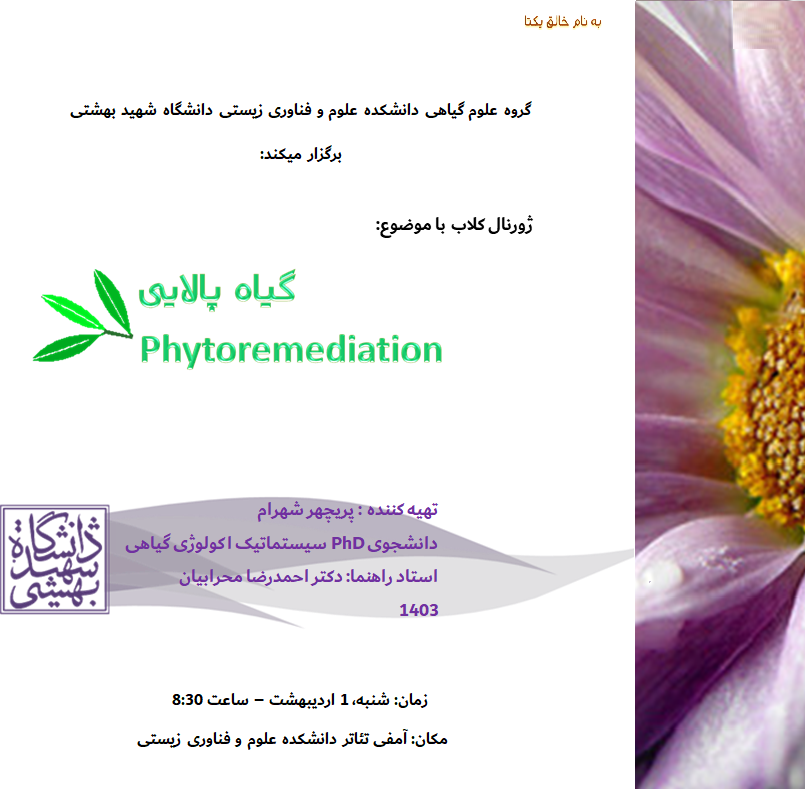 ارائه علمی خانم پریچهر شهرام دانشجوی دکتری سیستماتیک اکولوژی گیاهی دانشکده علوم زیستی با موضوع گیاه پالایی به راهنمایی آقای دکتر احمدرضا محرابیان در تاریخ 1403/2/1، ساعت 8 صبح در آمفی تئاتر دانشکده علوم و فناوری زیستی برگزار شد.