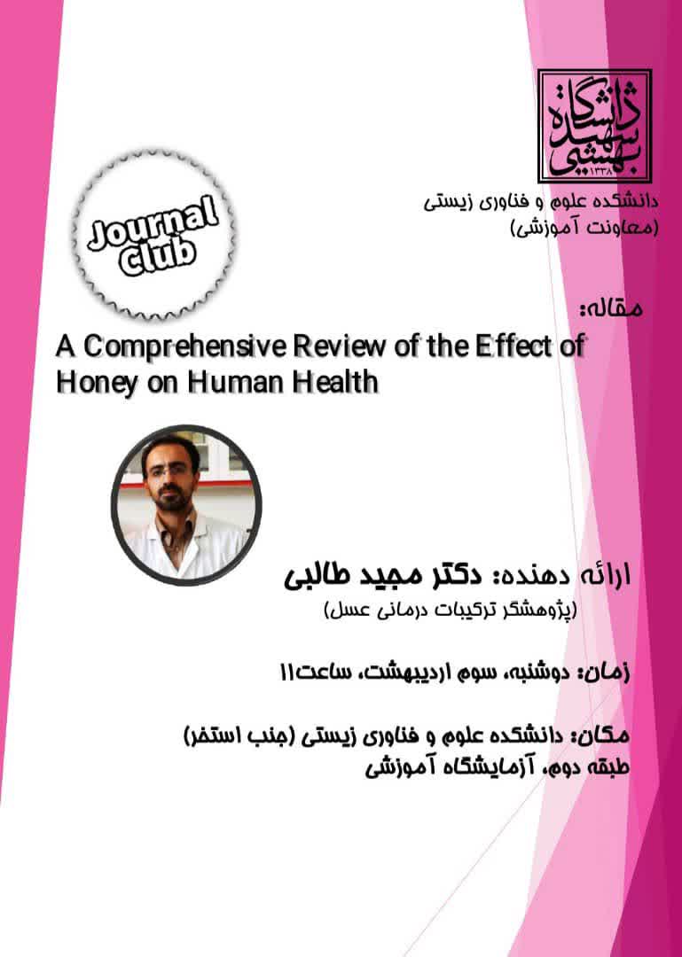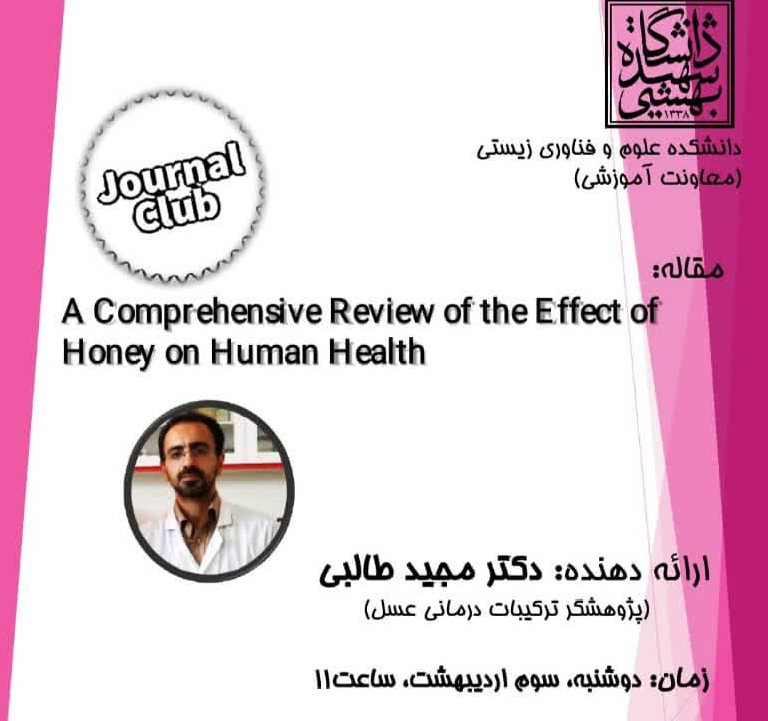ژورنال کلاب با عنوان "A Comprehensive Review of the Effect of Honey on humanHealth"توسط آقای دکتر مجید طالبی پژوهشگر ترکیبات درمانی عسل در تاریخ دوشنبه سوم اردیبهشت ماه ، ساعت 11 در طبقه دوم دانشکده علوم و فناوری آزمایشگاه آموزشی برگزار شد.