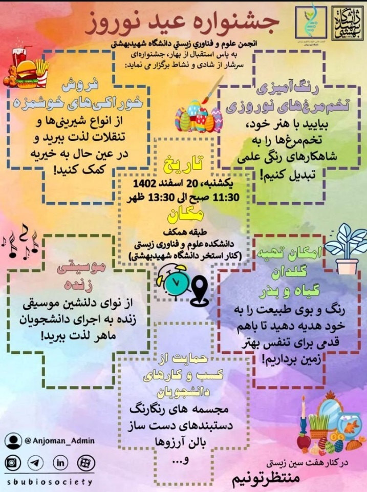 جشنواره عید نوروز در دانشکده علوم و فناوری زیستی  روز یک شنبه از ساعت 11:30 الی 12:30برگزار شد. این جشنواره شامل: فروش غذا و دسرهای لذیذ با هدف کمک به خیریه، فضایی برای رنگ آمیزی تخم مرغ های نوروز،هدیه هایی از جنس طبیعت و اجرای موسیقی به صورت زنده بود.