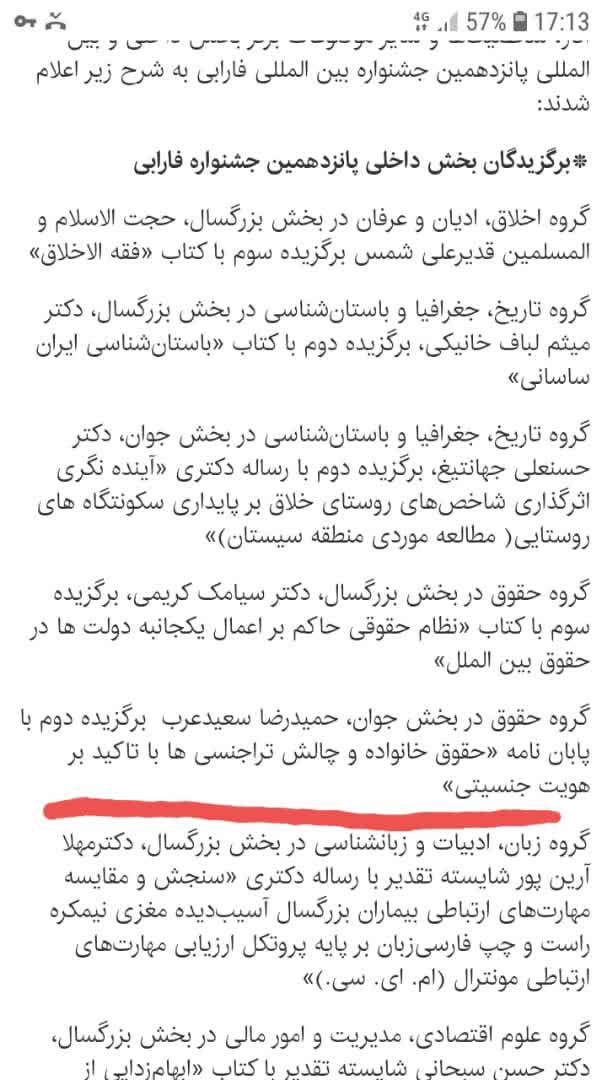 آقای حمیدرضا سعیدعرب، دانشآموخته دوره کارشناسیارشد حقوق خانواده دانشگاه شهیدبهشتی و دانشپژوه فعلی دوره دکتری مطالعات حقوق خانواده این پژوهشکده در پانزدهمین جشنواره فارابی در سال ۱۴۰۳ موفق به کسب درجه پایاننامه برگزیده دوم با موضوع "حقوق خانواده و چالش تراجنسیها با تأکید بر هویت جنسی" به راهنمایی خانم دکتر ماهرو غدیری و آقای دکتر محمد روشن شدهاند. پژوهشکده خانواده این موفقیت ارزشمند را به ایشان تبریک گفته و برایشان آرزوی توفیقات بیشتر در عرصههای مختلف علمی را دارد.