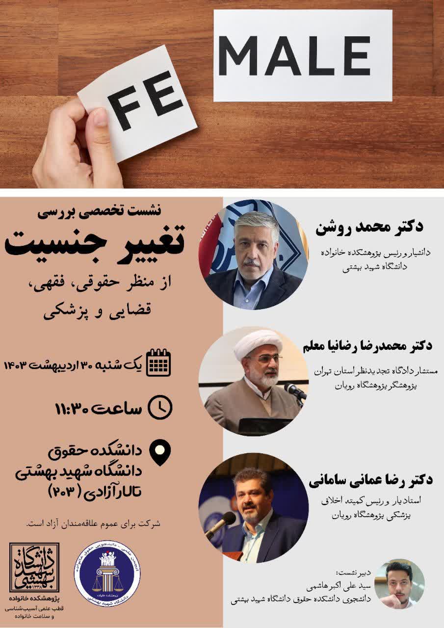 انجمن علمی - دانشجویی حقوق خانواده پژوهشکده خانواده دانشگاه شهید بهشتی برگزار میکند : نشست تخصصی بررسی تغییر جنسیت از منظر پزشکی، حقوقی، قضایی و فقهی با حضور :