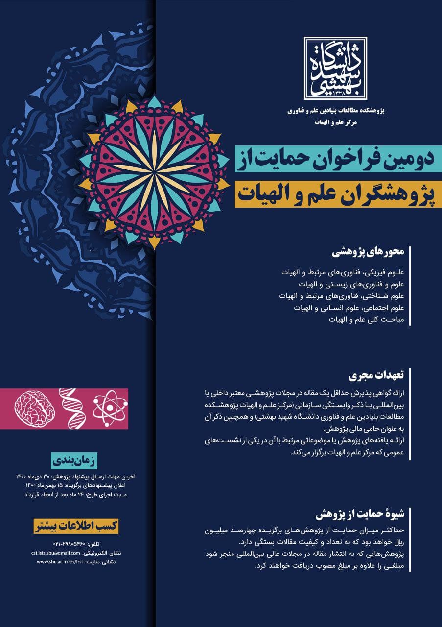 مرکز علم و الهیات پژوهشکده مطالعات بنیادین علم و فناوری دانشگاه شهید بهشتی قصد دارد برنامۀ پژوهشی آموزشی ترویجی‌ جامعی را در حوزۀ علم و الهیات اجرا کند. هدف از اجرای این برنامه تلاش برای فهم بهتر از نسبت علم و الهیات، خصوصاً رابطۀ علوم با الهیات اسلامی، از طریق انجام پژوهش‌های ممتاز و همچنین ترویجِ کاوش دربارۀ نسبت علم و الهیات در حوزۀ عمومی است. از همین‌رو، فراخوان حاضر از تمامی پژوهشگران این حوزه دعوت می‌کند پیشنهاد‌های پژوهش خود را با در نظر گرفتنِ موارد ذیل به دفتر مرکز علم و الهیات به نشانی الکترونیکی  cst.ists.sbu@gmail.com ارسال کنند.