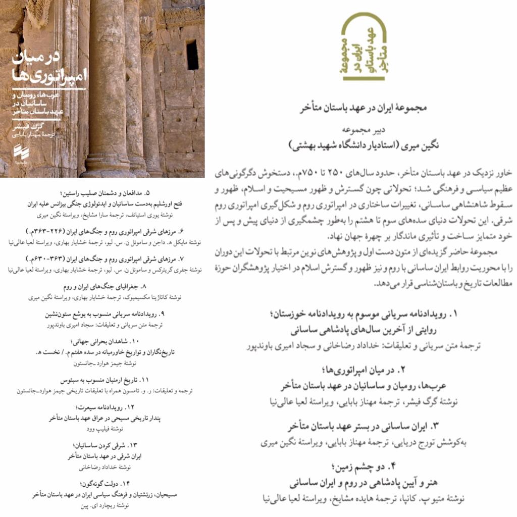 چهارده عنوان کتاب از میان متون دست اول و پژوهشهای نوین درباره تحولات ایران در عهد باستان متاخر (سده های ۳ تا ۸ م.) با محوریت روابط ایران ساسانی و روم و نیز ظهور و گسترش اسلام جهت انتشار در این مجموعه توسط ایشان انتخاب شده است؛ از میان دو عنوان منتشر و شش عنوان نیز در فرایند ویرایش و در نوبت انتشار قرار دارند.