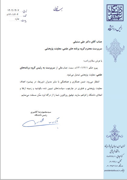 طی حکم شماره 911/1/130/د، مورخه ۱۴۰۲/۴/۷ از طرف رئیس محترم دانشگاه، آقای دکتر سنبلی بهعنوان رئیس گروه برنامههای علمی، معاونت پژوهشی دانشگاه شهید بهشتی منصوب شد.