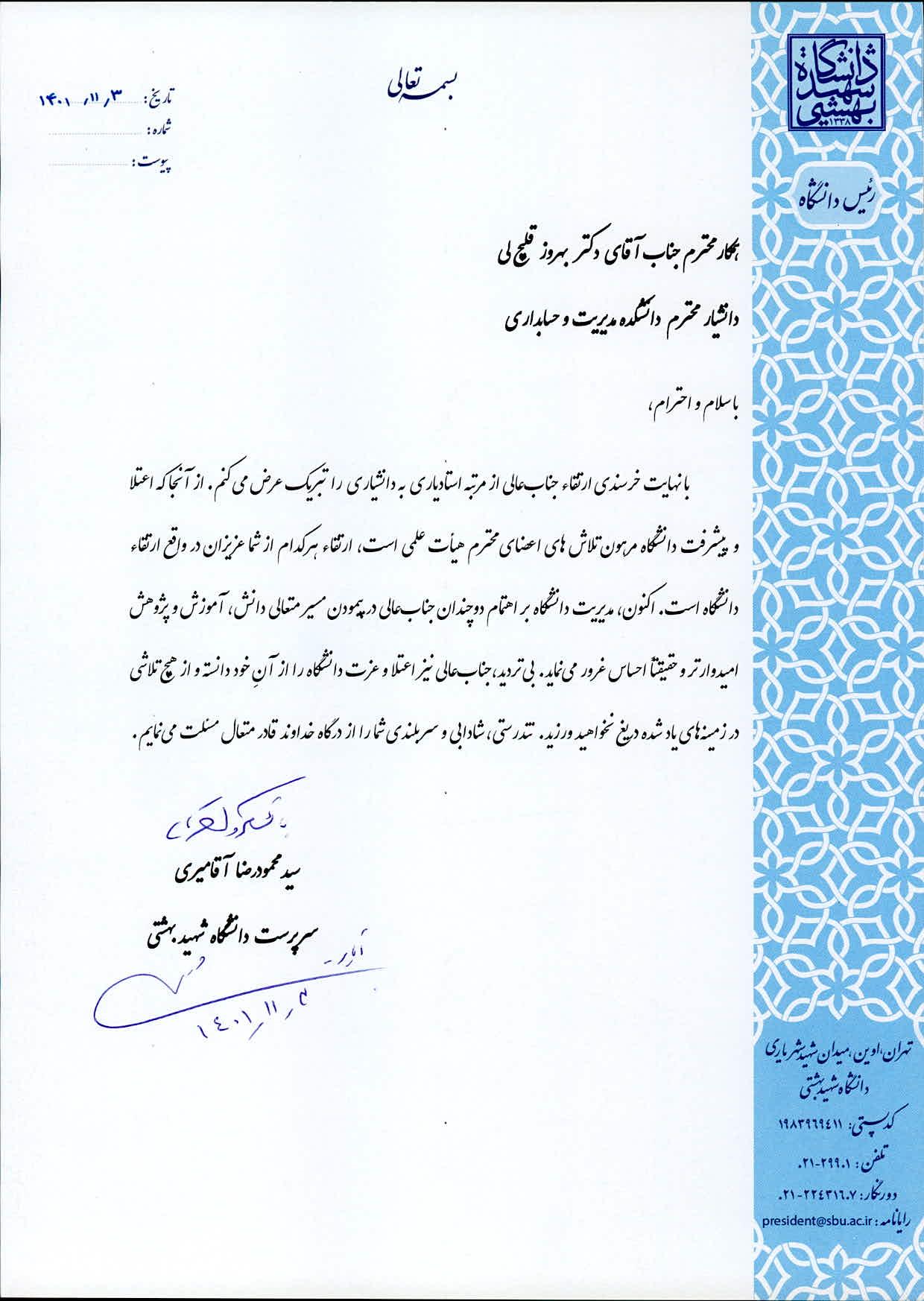 دکتر سید محمود آقامیری، رئیس دانشگاه شهید بهشتی، با ارسال پیامی ارتقاء مرتبه علمی دکتر بهروز قلیچ لی، عضو هیات علمی دانشکده مدیریت و حسابداری را از مرتبه استادیاری به دانشیاری تبریک گفت. متن پیام به شرح زیر است:
