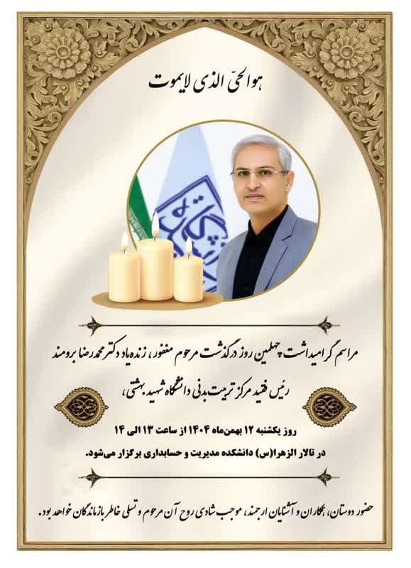 به اطلاع می رساند مراسم گرامیداشت چهلمین روز درگذشت زنده یاد دکتر محمد رضا برومند روز یکشنبه 12 بهمن 1404 از ساعت 13 الی 14 در تالار الزهرا دانشکده مدیریت و حسابداری برگزار می شود. حضور دوستان، همکاران و آشنایان ارجمند موجب شادی روح آن مرحوم و تسلی خاطر بازماندگان خواهد بود.